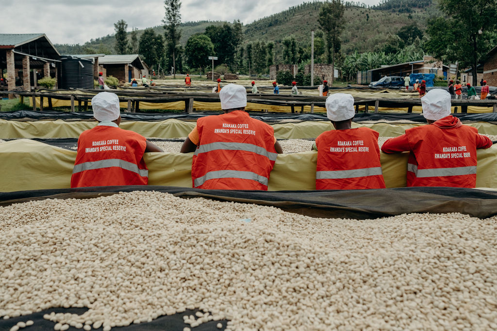 Our own coffee is grown at the edge of the Nyungwe rainforest, the protected natural reserve and the green lung of the region. The wet processing method used involves carefully collecting coffee cherries from farmers, sorted by quality. The freshly harvested cherries are then de-pulped and dried in the sun for around two 2 weeks and before being stored. The process involves control measures at every stage of the value chain so as to ensure good quality coffee. This includes quality checks from coffee in the farms to the processing and exportation and cupping of the coffee on site.